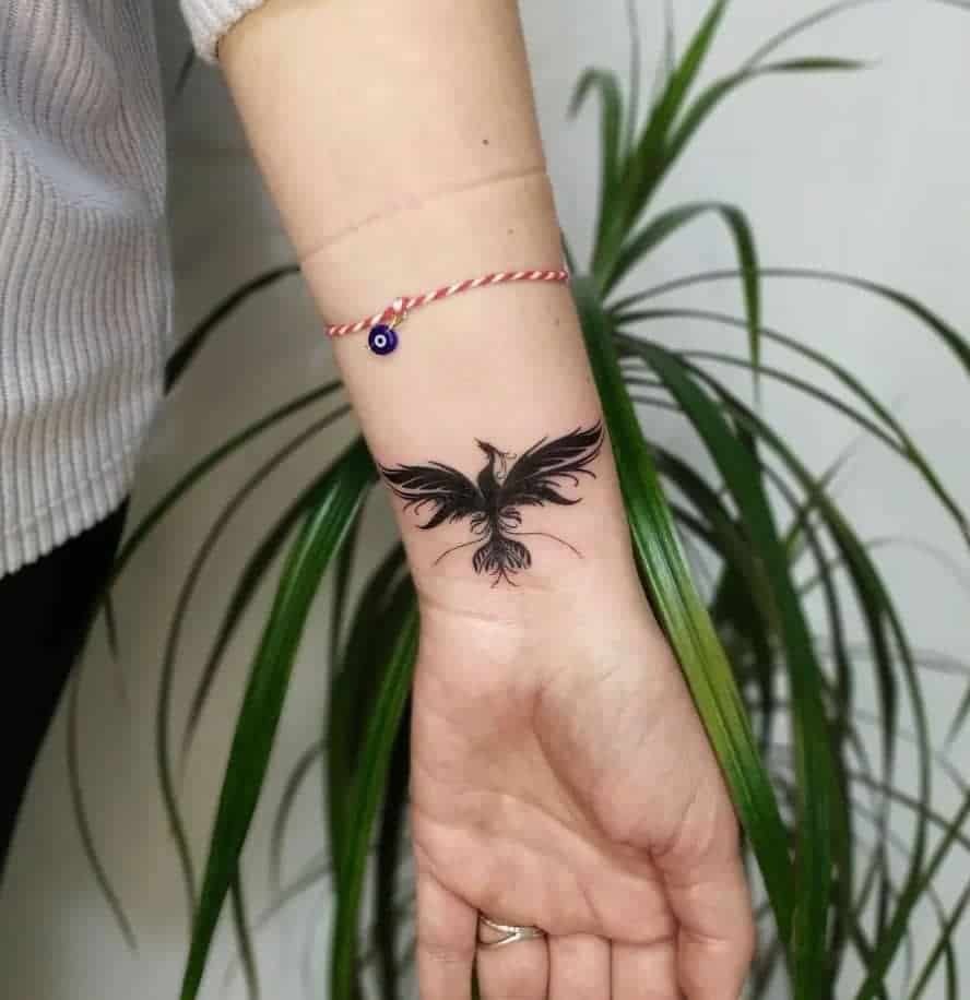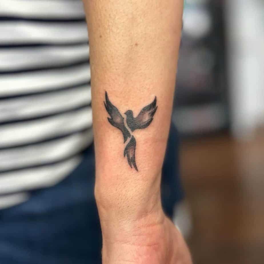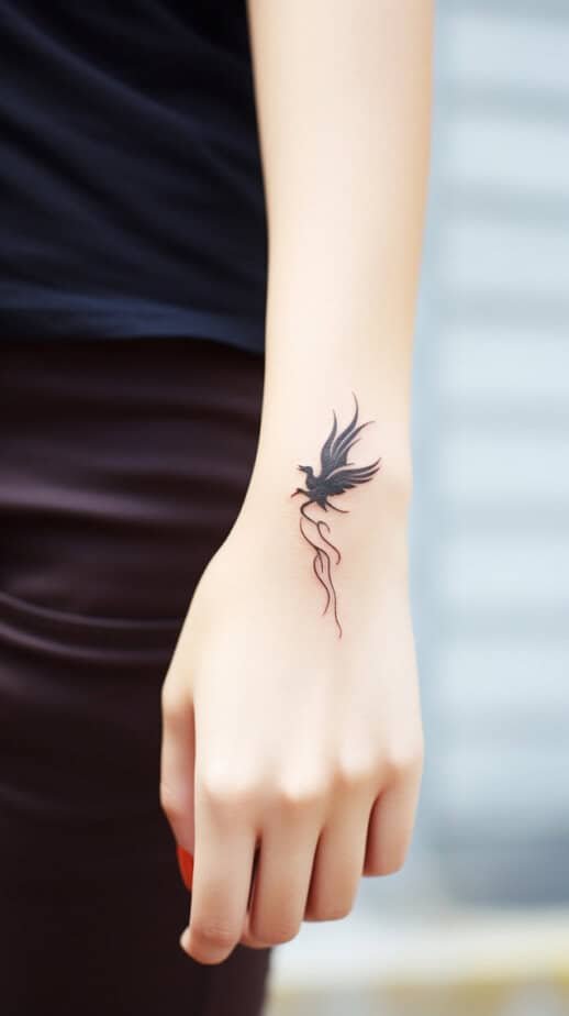 Wrist tattoos are like secret notes to yourself. A three-part or slightly abstract phoenix on the wrist reads classic and permanent, and you don’t need a ton of ink to make the meaning loud. These are simple, mostly black-ink designs that still feel sacred — perfect if you want a daily reminder without a full commitment to a bigger piece.