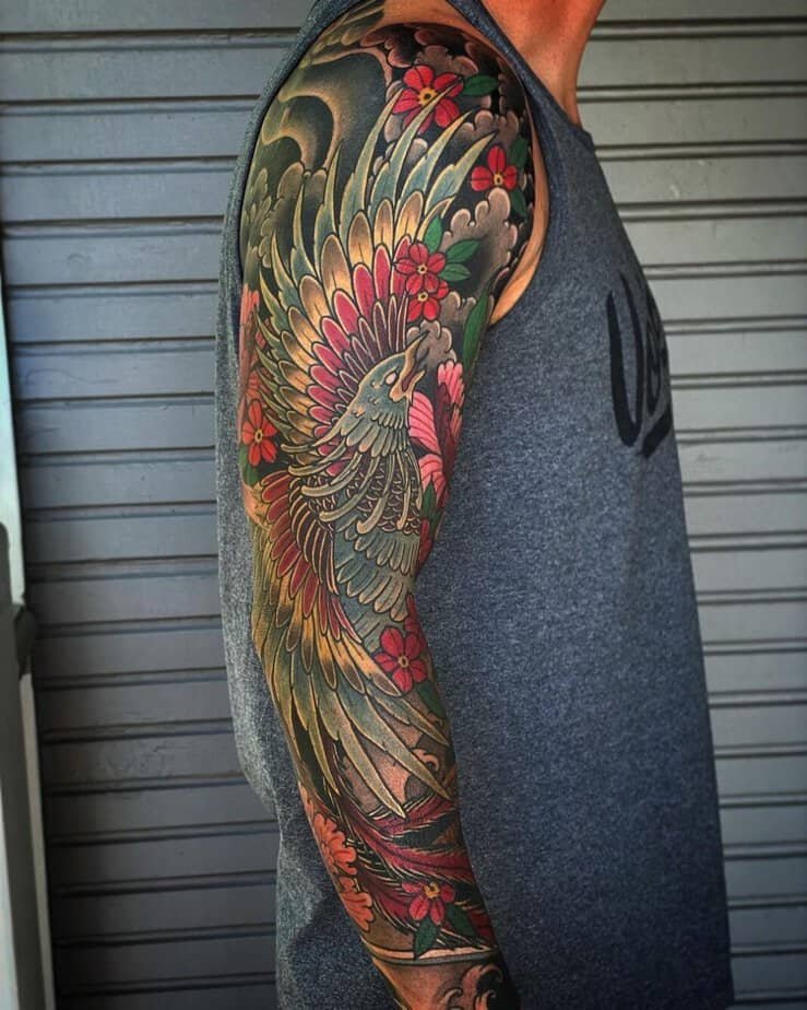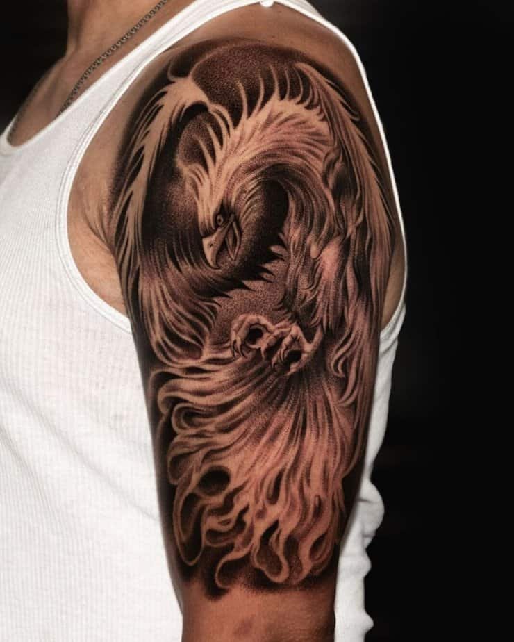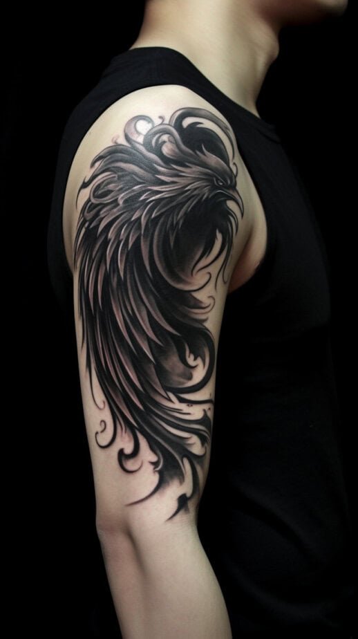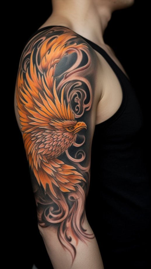 There’s something regal about a shoulder-to-upper-arm phoenix — like the bird is perched, watching over you. Colorful, detailed Japanese-style pieces look gorgeous here and suit anyone, regardless of gender. Go bold and loud or keep it darker so the phoenix really pops against your skin; both choices say strength, but one whispers and the other roars. Either way, it reads like armor you chose for yourself.