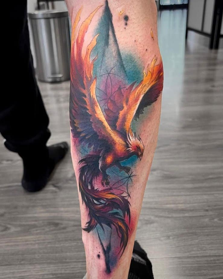 Leg pieces read like stories in motion — every step gives the artwork life. These designs are simple and feminine but still pack that message: you can overcome anything. Think oranges, blues, and purples mixed together so the flames feel almost alive; mix in some detail and you get a unique, traditional-feeling phoenix that still belongs to you. The leg gives you room for details, so if you love watching a tattoo come alive over time, this spot is a sweet choice.