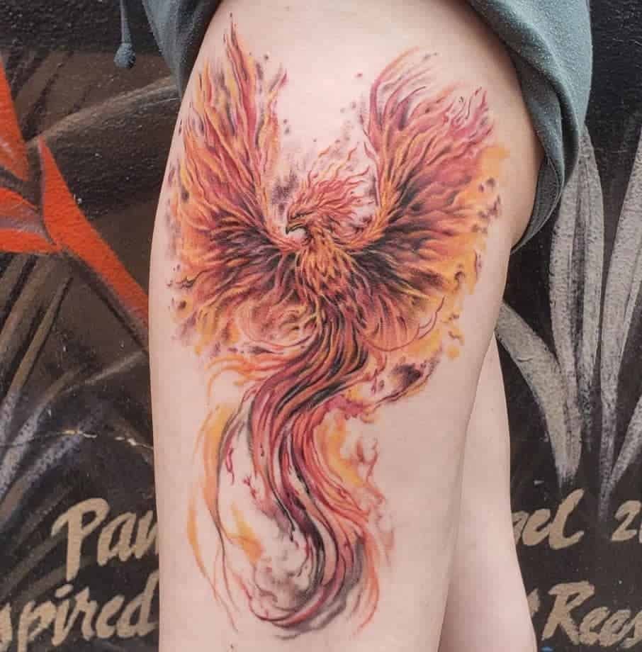 If you’re the type who wants your story to be seen from a mile away, a sleeve is the move. Trash polka, traditional, abstract — any of those styles will make the phoenix wrap and shift with your arm, so every gesture adds drama. Bright oranges and reds will pop against cooler blues, and as a sleeve, the piece becomes a narrative: wings, ash, rebirth. It’s commitment, yes, but it’s also a gorgeous way to show the layers of you.