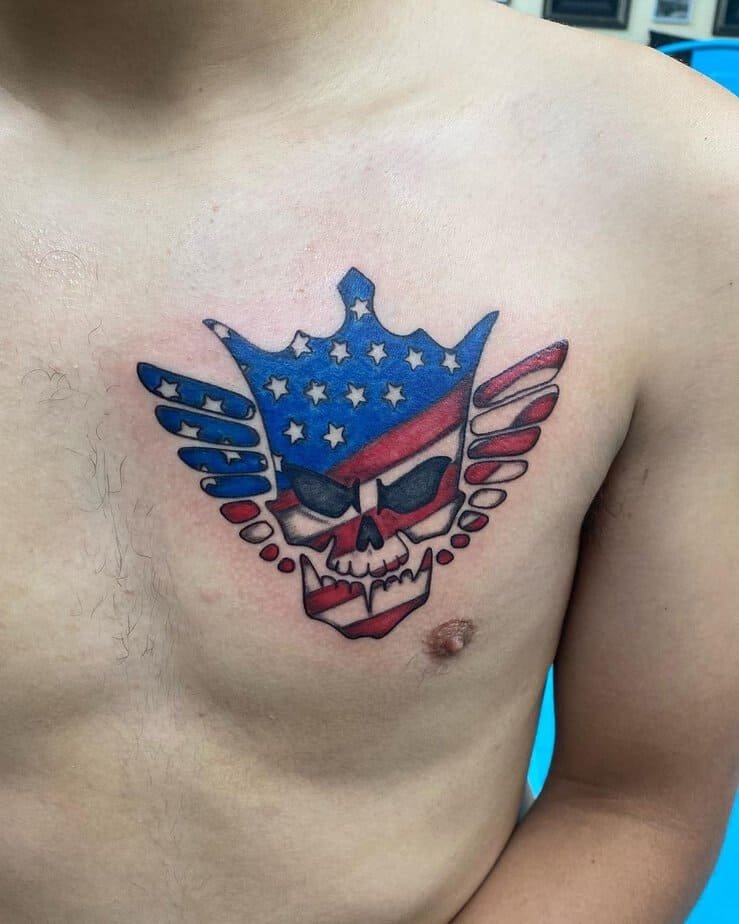 Another tear-out style, this chest piece uses the ripped-skin effect to say your patriotism is under the surface, right down to your core. It’s theatrical and deeply symbolic.