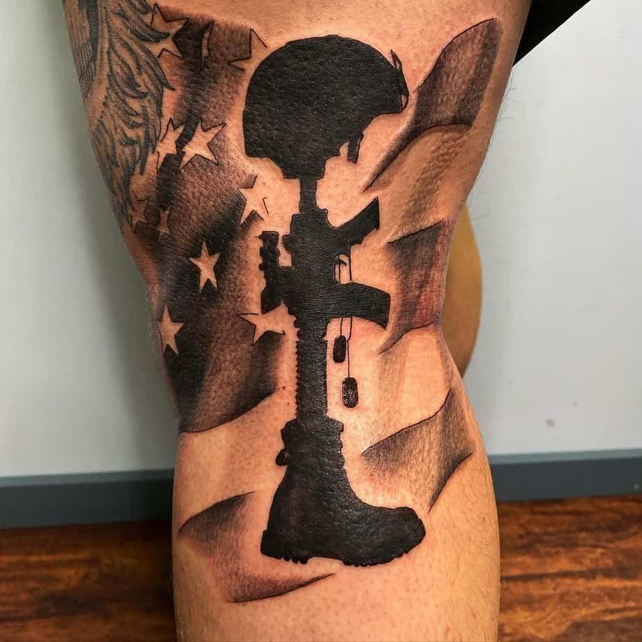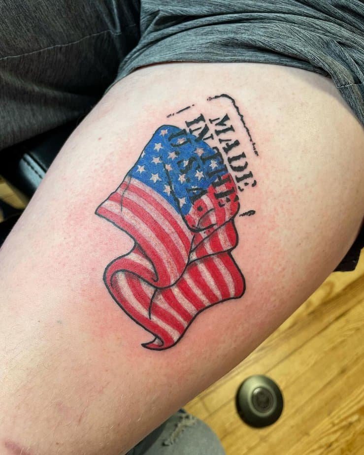 If you like your patriotism with grit, this ripped-up, weathered flag on the thigh gives off that raw vibe. It’s edgy, textured, and feels like a symbol that’s been through some stuff — which, honestly, makes it more interesting.