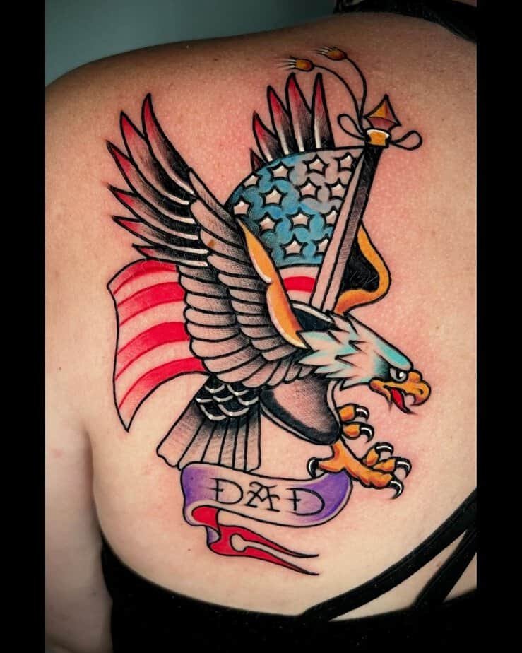 Classic American tattoo energy: eagle, flag, and a banner that reads "Dad." Bright colors, traditional lines, and a sentimental nod to family — timeless.