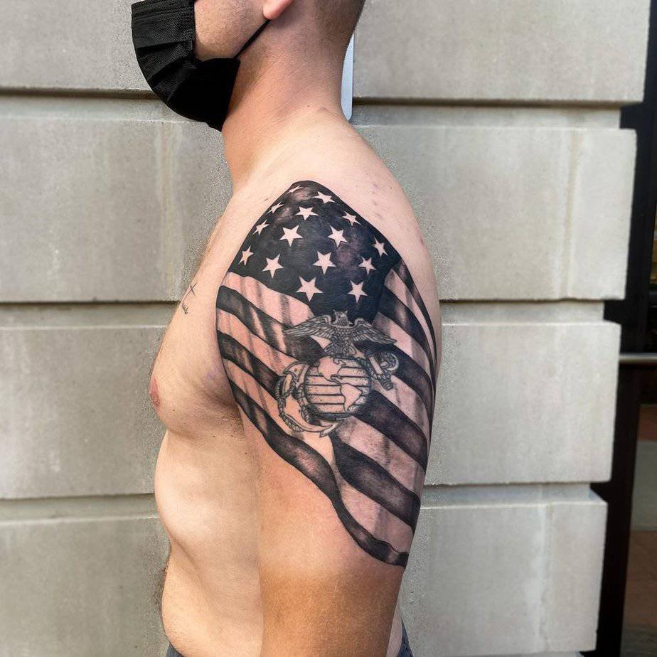 A bold arm tattoo of a bald eagle with the flag beneath feels classic and honorable — very traditional Americana. It’s the sort of piece that reads loud and proud without apology.