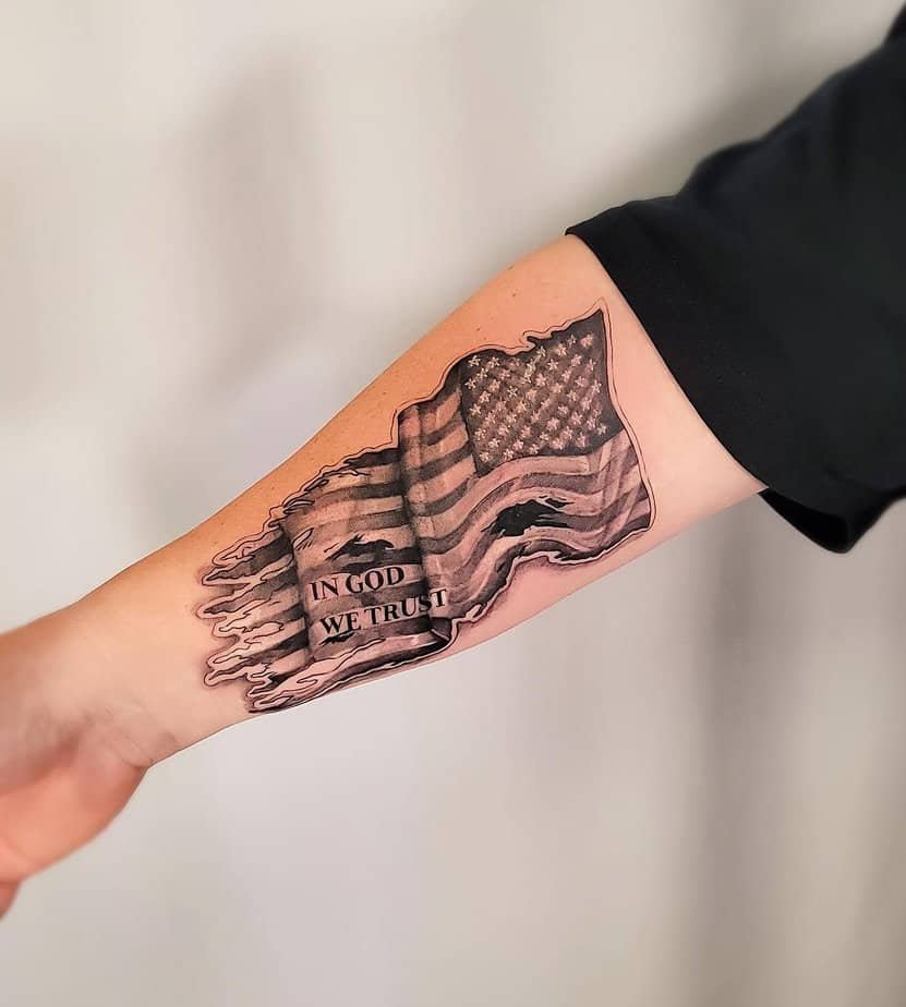 Faith and patriotism combined into one forearm piece. It’s direct and meaningful, the kind of tattoo you choose when those words carry real weight for you.