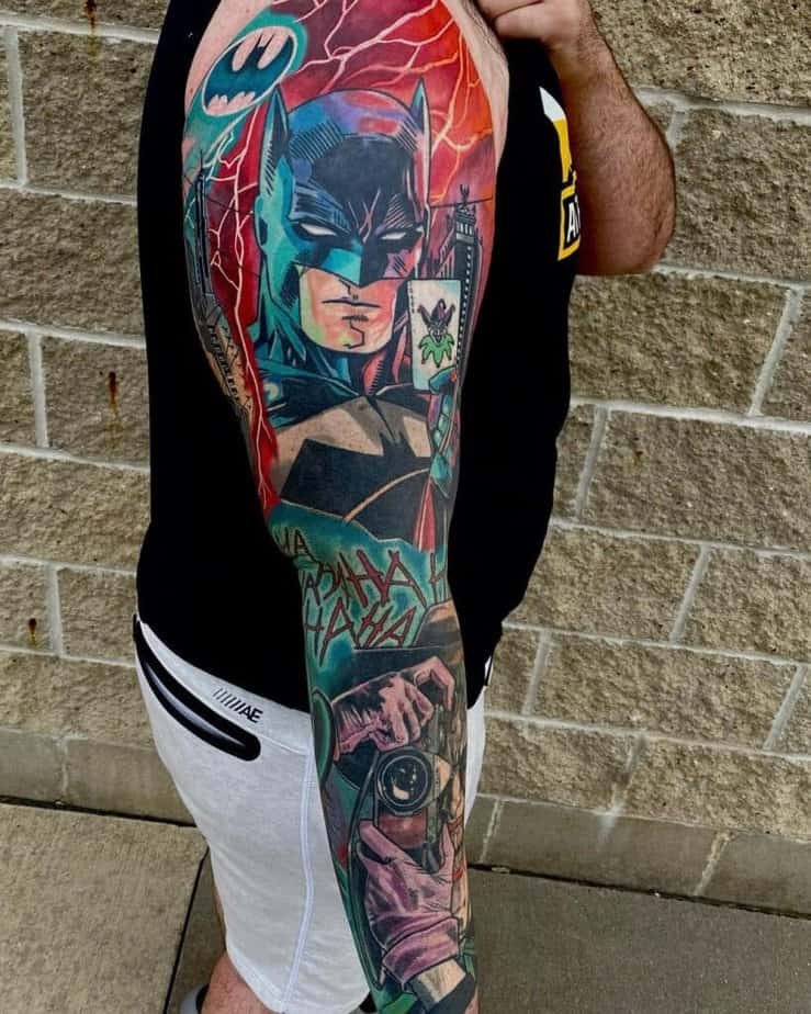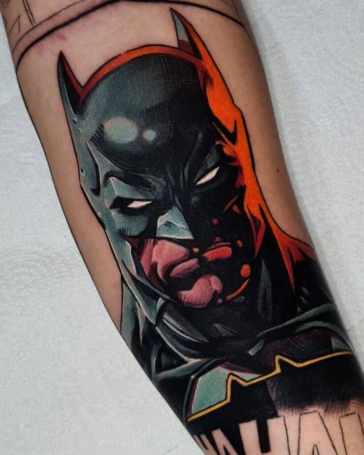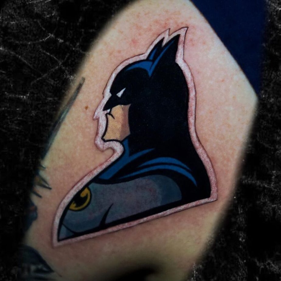 Color can turn Batman from gothic legend into a playful, comic-book energy — and that contrast is everything. Imagine a small, almost cute Batman with soft shading and color making him look a tiny bit innocent compared to the grown-up brooder. Or go sticker-style: bold outlines, flat color, like you peeled a panel right off a classic comic. Then there are dramatic uses of color — deep reds hitting one side of his cowl, white ink flashing in the eyes, bats silhouetted behind him — things that make the piece feel like it’s lit from a neon sign. And full sleeves? If you want to go all in, saturated colors will make every panel of your sleeve scream fandom in the best possible way.
