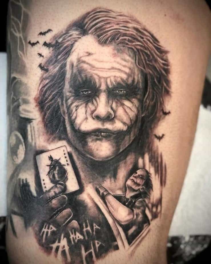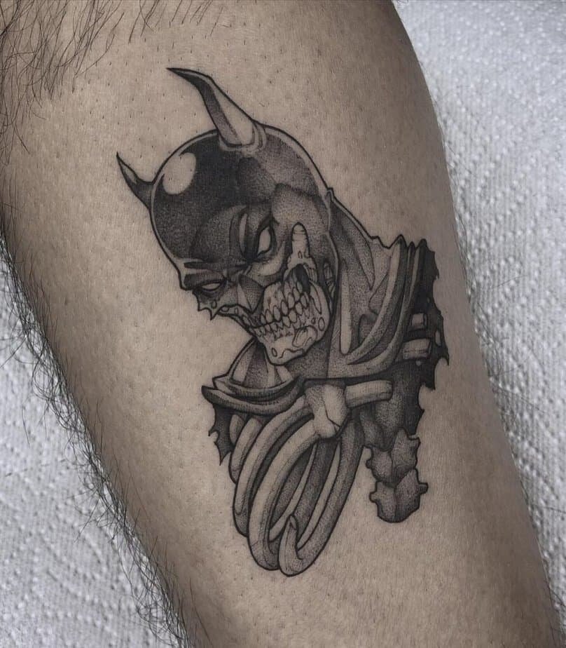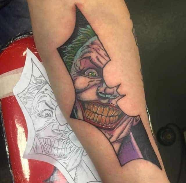 You can’t talk Batman without thinking of his eternal chaos buddy, the Joker. Tattoos of him are wild — hyper-real faces with every wrinkle and grin rendered so you can feel his madness, or clever mash-ups where his face fills the Batman symbol so you get both sides of the story in one image. Little details — yellowed teeth, the Joker playing card tucked into the design, bats circling around — tell a whole messy, brilliant tale. If you want drama and storytelling in one tattoo, Joker pieces bring it.