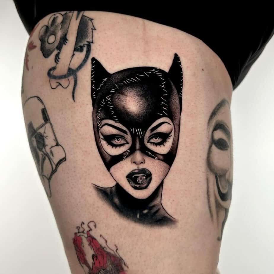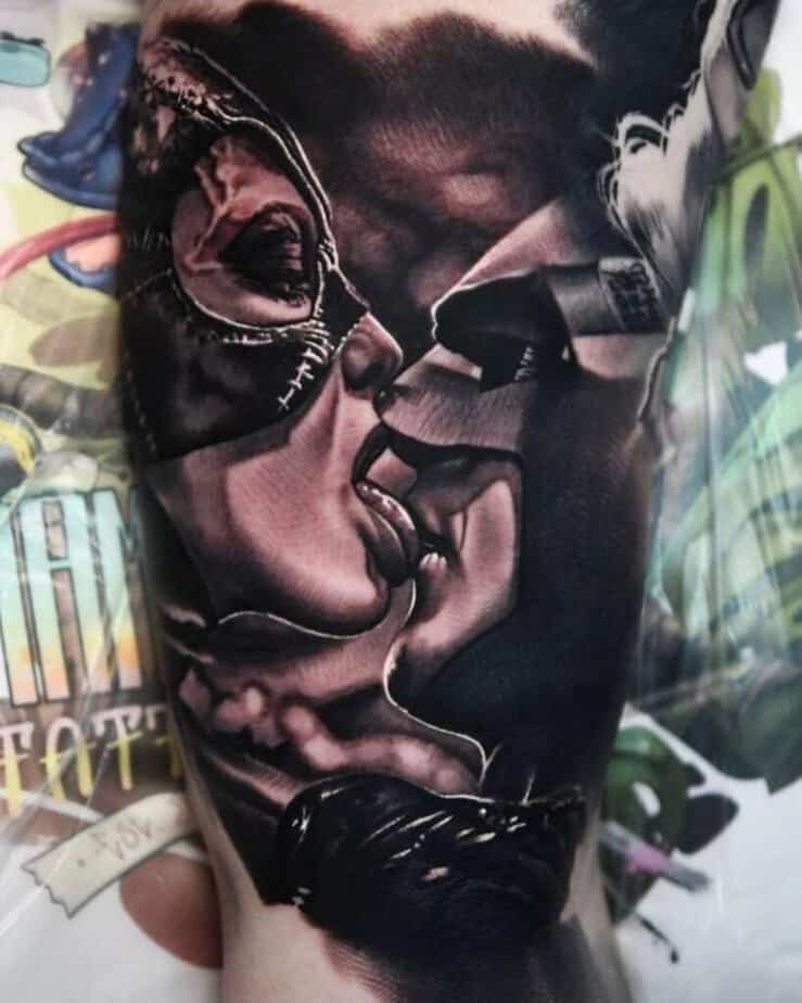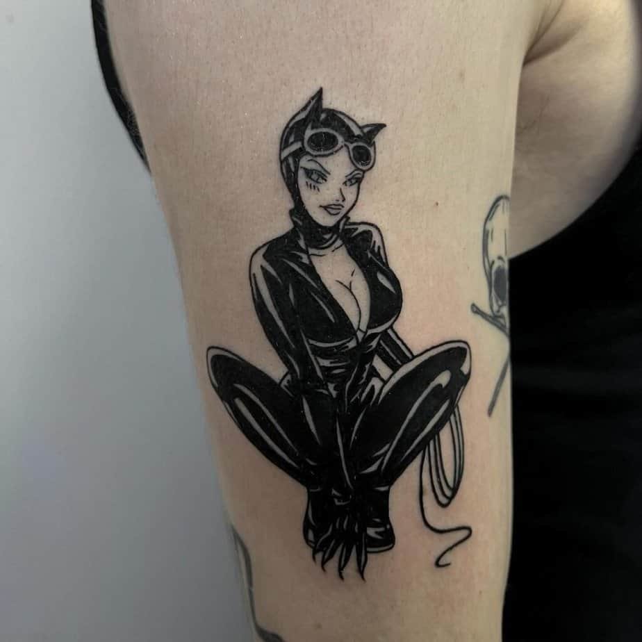 If you love the Batman universe but don’t want the Bat himself, Catwoman is a perfect pick. She’s powerful, mysterious, and stylish — which shows up beautifully in tattoos. A slick full-body Catwoman in black ink with reflective lines suggests latex and light; a posed figure with a whip is all attitude. There are softer, sensual moments you can ink that capture the chemistry between her and Batman — lower-key than the big hero portraits, but so authentic. And yes, she can headline the piece while a tiny bat symbol in the sky gives a little nod to Gotham.