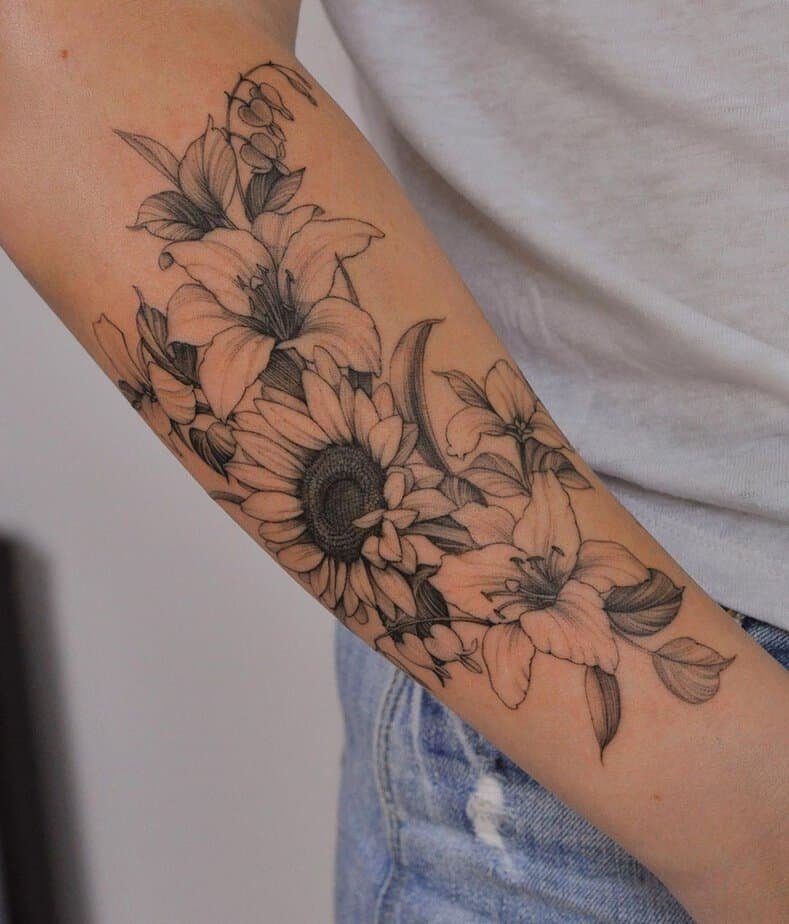 Black-and-gray forearm with sunflowers and lilies