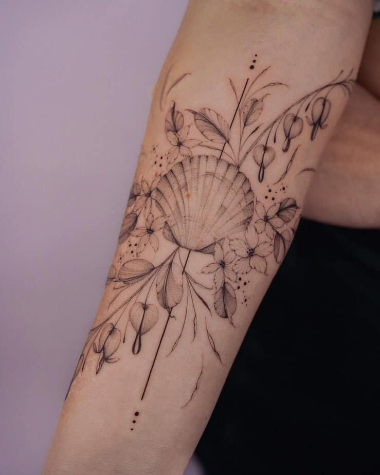 A delicate shell with dotwork and blooms