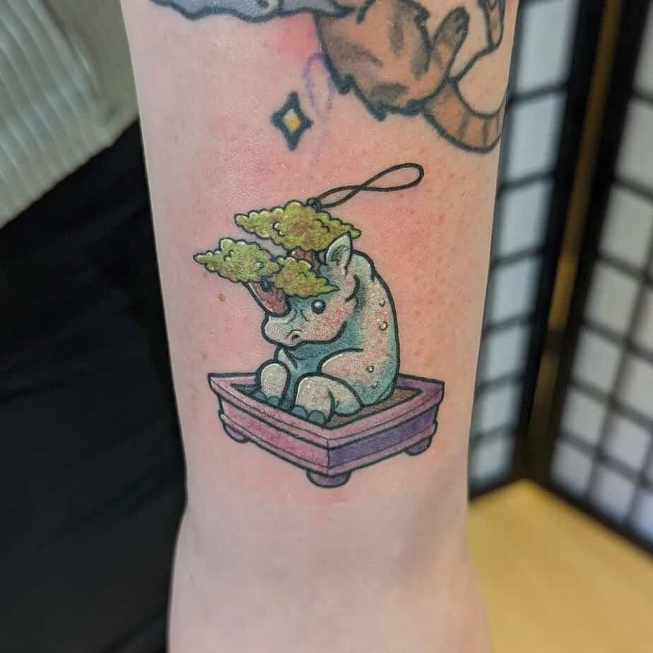 A mini rhino sitting in a pot with a bonsai sprouting from its horn feels playful and tough at the same time. Rhino symbolism brings power and protection, and the little bonsai softens it into something sweet and meaningful.