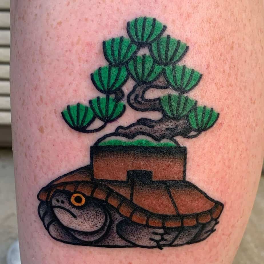 Turtle carrying a bonsai — slow strength and longevity