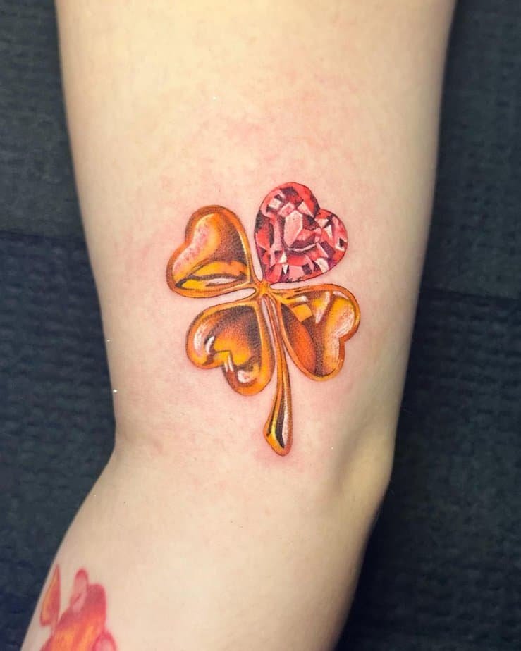 This upper-arm clover mixes chrome orange and red, with one red leaf that gives it a romantic, heartlike touch. It’s playful, lucky, and a little unusual thanks to the color play—perfect if you want charm with a metallic edge.