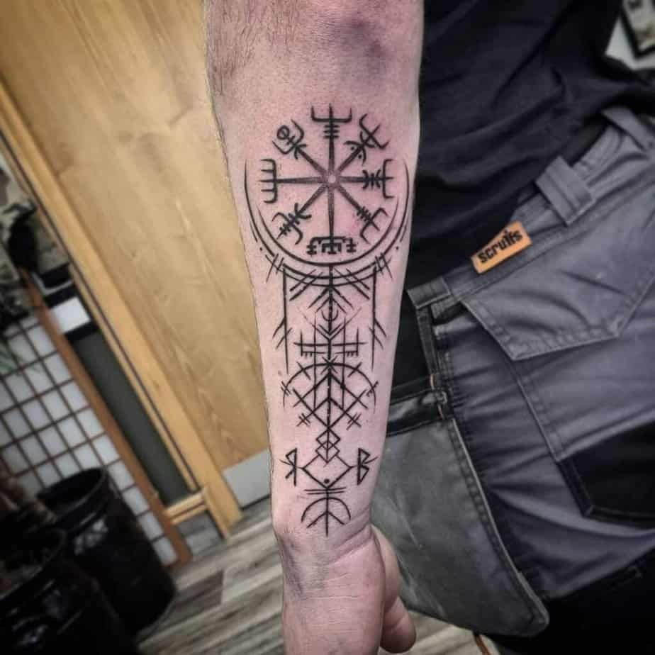 These feel more like a statement for someone who loves bold lines and stories you can read on skin. Full forearm pieces with thick black work tell that warrior/traveler story — they look like they’ve earned their marks. Then there are the runic compasses: simpler, scratchy, a little rough around the edges, but full of history. Runes have been tattooed for centuries, so they carry that nod to ancestors that’s quiet but powerful.