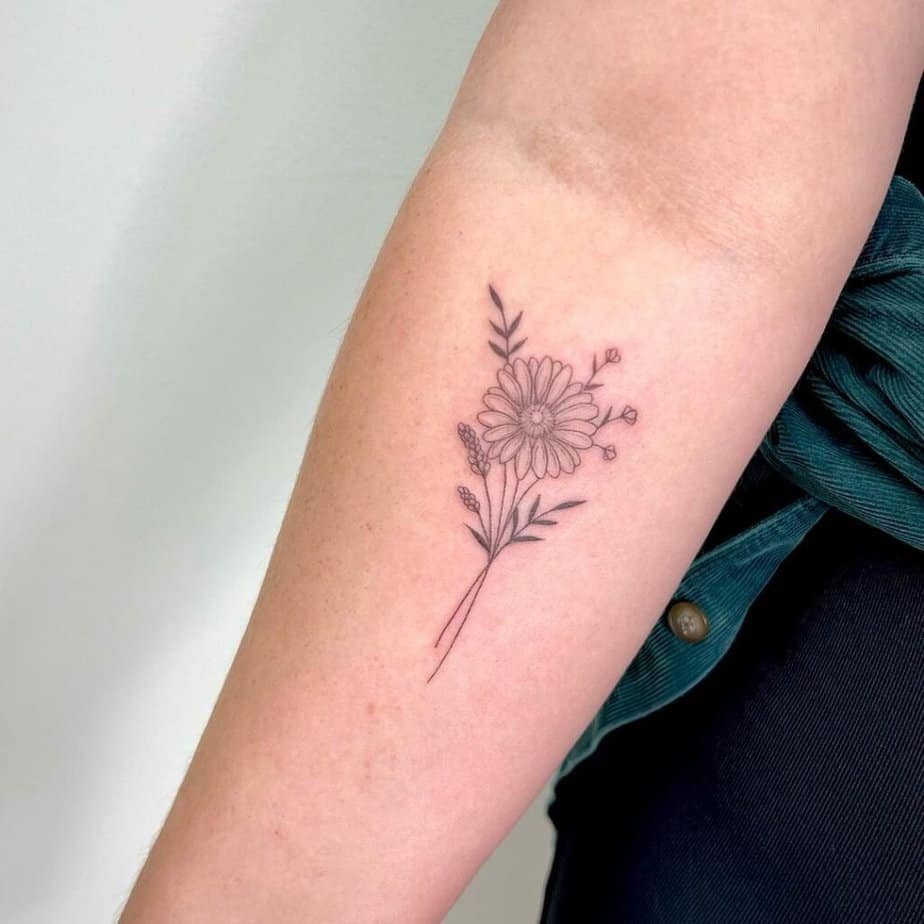 Okay, so picture a delicate daisy with a thin stem and a couple of leaves — it’s practically storybook energy. Flower tattoos win because they’re elegant without trying too hard, and this kind of tiny, refined daisy is a sweet way to try out floral ink without committing to a whole sleeve.