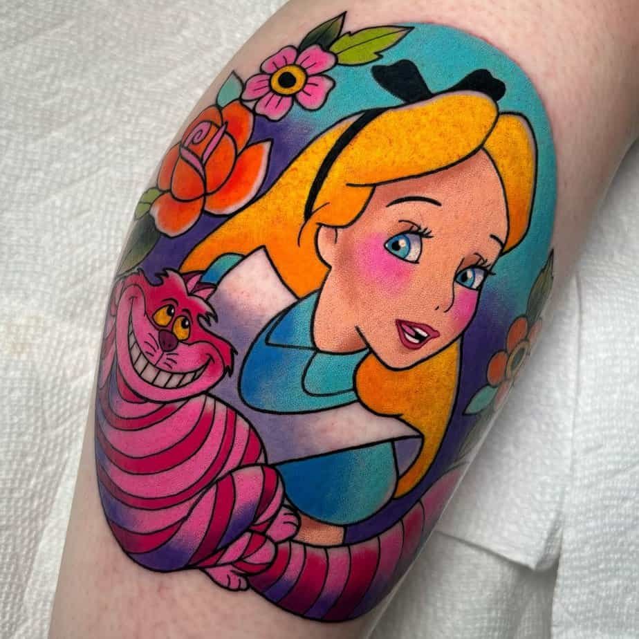 Alice and the Cheshire Cat together are a recipe for whimsical mischief. This colorful tattoo catches their playful contrast — Alice’s curiosity and the Cat’s tricksy wisdom. It’s joyful, a little weird in the best way, and reminds you to trust your odd little instincts sometimes.