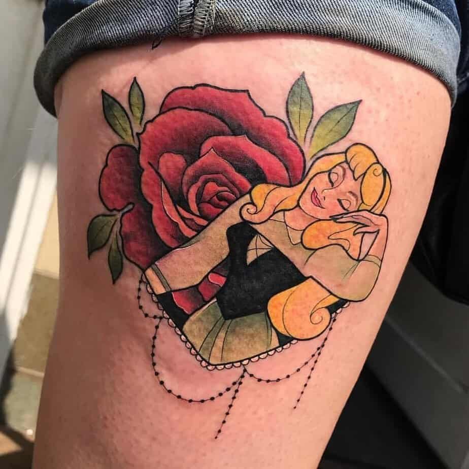 This leg piece frames Aurora and a big red rose into a heart, which feels both classic and tender. The rose is the thorny symbol of her sleep, and the whole composition is a nod to the idea that love — patient and true — can wake you up. It’s feminine and graceful without trying too hard.