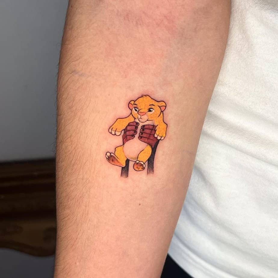 Seeing baby Simba held up on Pride Rock is like getting a shot of courage and curiosity. This forearm tattoo screams adventure and the small, stubborn bravery we all carry from childhood. It’s a sweet reminder to stay curious and to protect that spark.