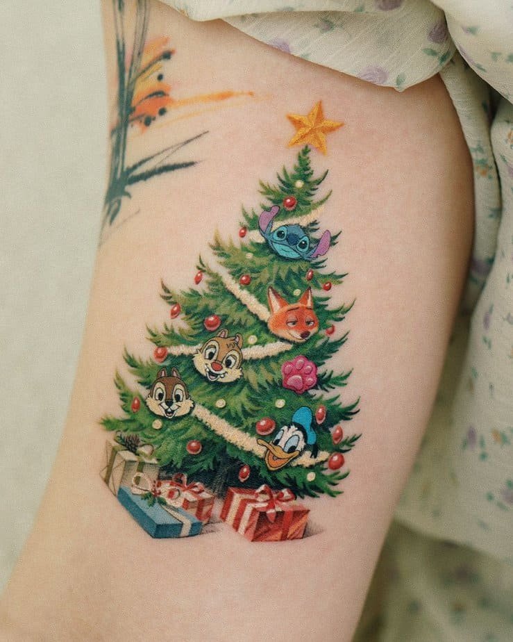 Imagine an upper arm tattoo that’s basically a holiday mash-up of your favorite characters: Donald Duck at the base, Chip and Dale, Nick Wilde, and Stitch right under the star. Presents waiting to be opened and that whole warm, chaotic joy of Christmas morning — that’s what this design gives you. It’s playful, nostalgic, and perfect if you want your ink to feel like a festive memory.