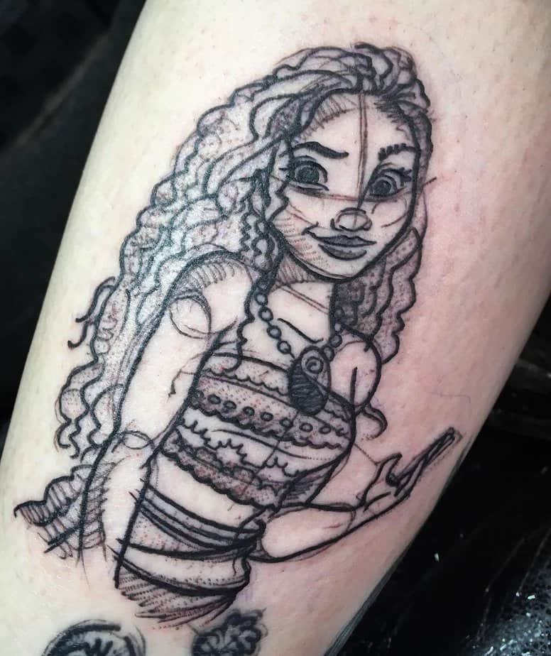This sketch-style Moana tattoo feels raw and fierce. Her flowing hair and that necklace her grandmother gave her are done with light, confident strokes, and it reads as a mantra: be brave, believe in yourself, keep moving forward. It’s powerful and quietly beautiful.