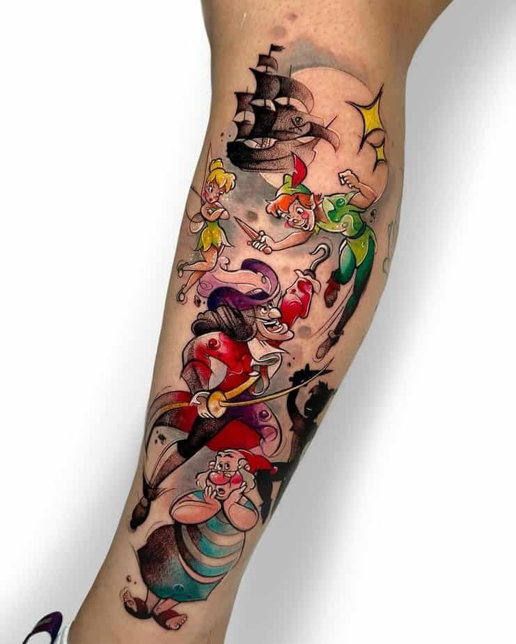 This colorful scene has Peter Pan mid-adventure, battling Captain Hook with Tinker Bell buzzing overhead. It’s the kind of tattoo that nudges you to keep a little wonder in your pocket, even as adulting gets loud. That sense of curiosity and mischief? Worth protecting.