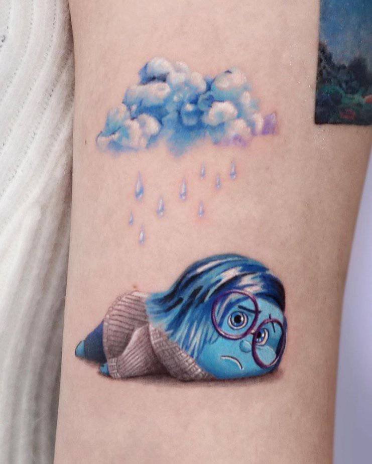 Sadness gets her moment here with a little rain cloud overhead — the perfect tiny visual metaphor. She’s melancholic, sure, but also empathetic and thoughtful, and this tattoo feels like a soft reminder that every emotion has value. It’s honest and quietly beautiful, the kind of tattoo you look at and feel seen by.