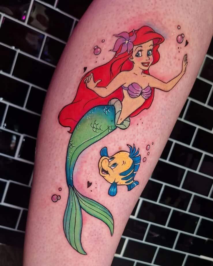 Ariel and Flounder together are bright, adventurous, and full of heart. This tattoo celebrates curiosity, the courage to pursue what you want, and how friendship helps you through the deep waters. It’s colorful and hopeful — a literal splash of joy.