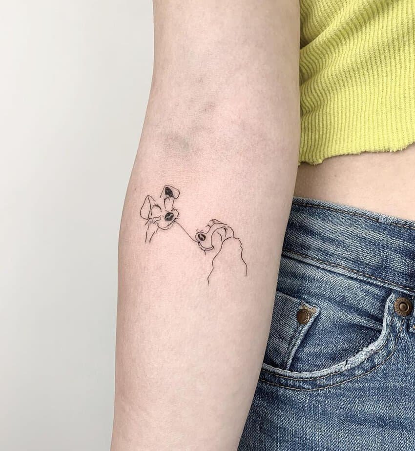 That iconic spaghetti moment — it’s romantic and goofy all at once. This fine-line tattoo captures the sweetness of that kiss without being saccharine. If you want a piece that whispers “gentle, goofy love,” this one’s the vibe.
