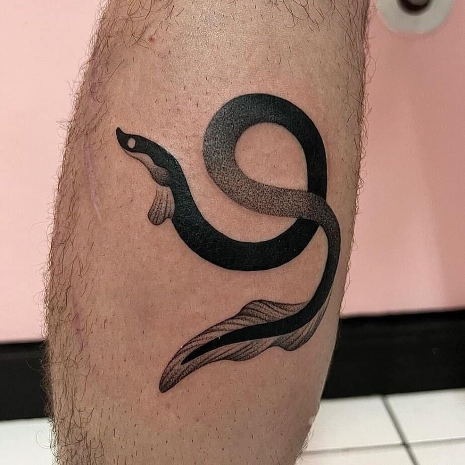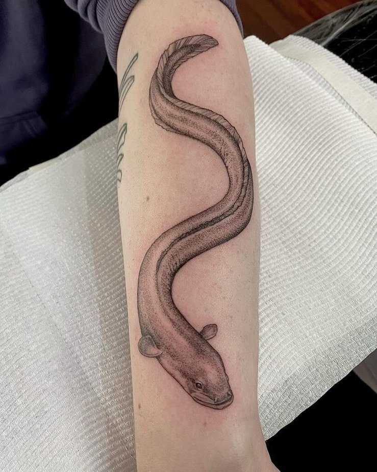 Okay, this one is delightfully eerie. Deepwater eels lean into darkness and stealth, so if you’re vibing with moody, shadowy tattoos this design totally works. It embraces the eel’s natural dark tones and kind of feels like wearing a secret — subtle but intense.