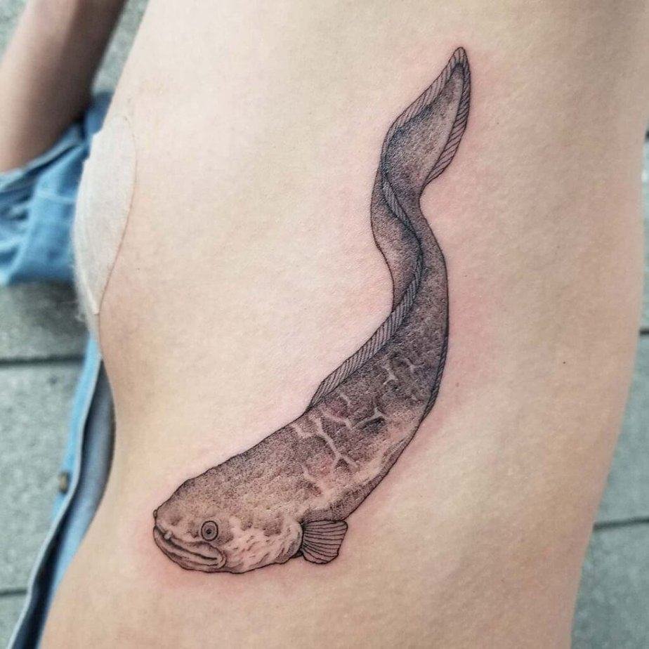 If you’re down for a tattoo that flows across your arm (or wherever you want it), the longfin eel is ideal. Its length lets it wrap and move with your body, and I’m here for that dot-work detail that gives the whole thing life.