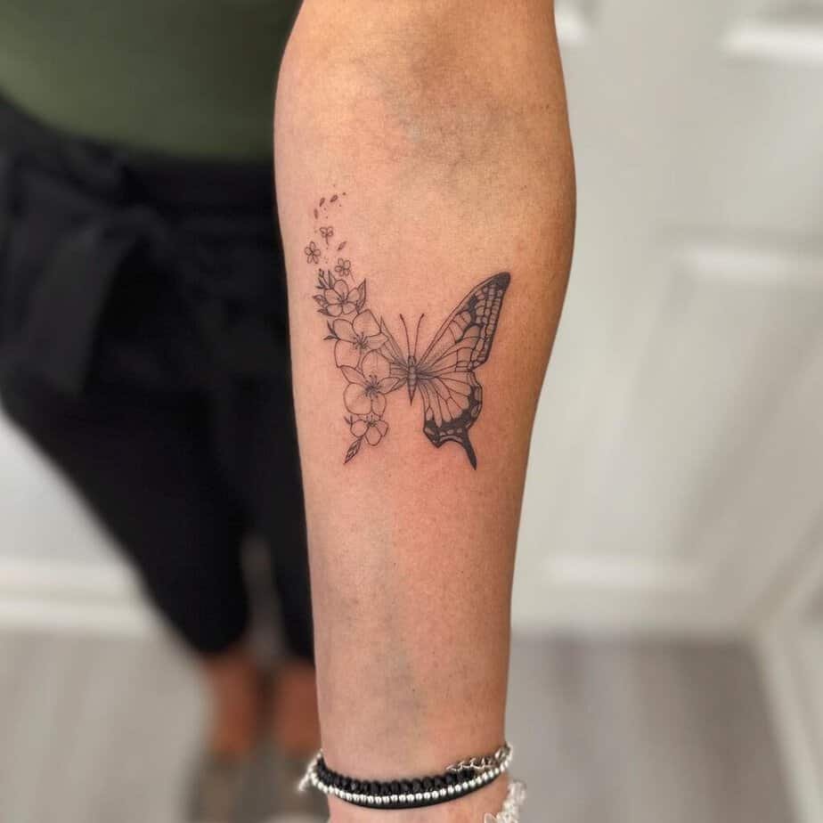 Butterflies are such a gentle symbol of rebirth, and when they’re woven into floral forearm pieces you get this soft, resilient energy. There are delicate Sakura flowers with a tiny butterfly perched nearby — the fine line work speaks to fragility and quiet strength. Some artists mix it up more abstractly, turning flowers into a butterfly wing that seems to lift off the arm. Or, if you want drama, go bold: a half-sleeve with a moth, a little bee, and negative-space bracelets surrounded by florals — still feminine, but unapologetically striking.