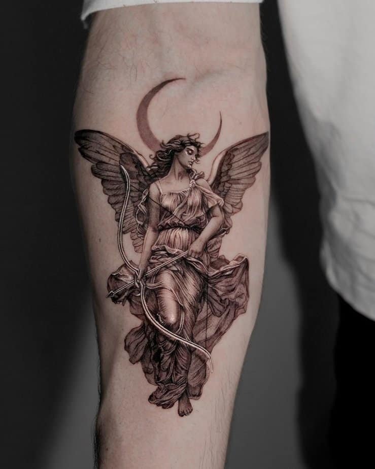 There’s so much mythology in this one: Artemis’ bow and arrow woven with a crescent moon. It’s an ode to wilderness, protection, and feminine independence — perfect if the forest feels like home to you.