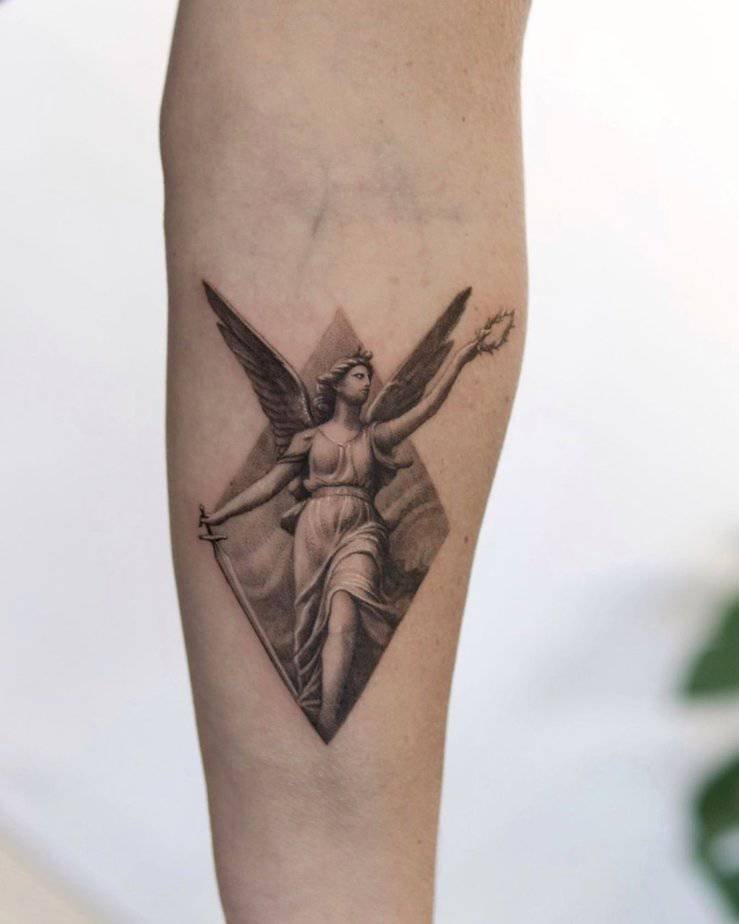 This one feels cinematic: a majestic Goddess of Victory, robes flowing, stance triumphant. It’s both ethereal and strong — the kind of tattoo that makes you feel a little braver just looking at it.