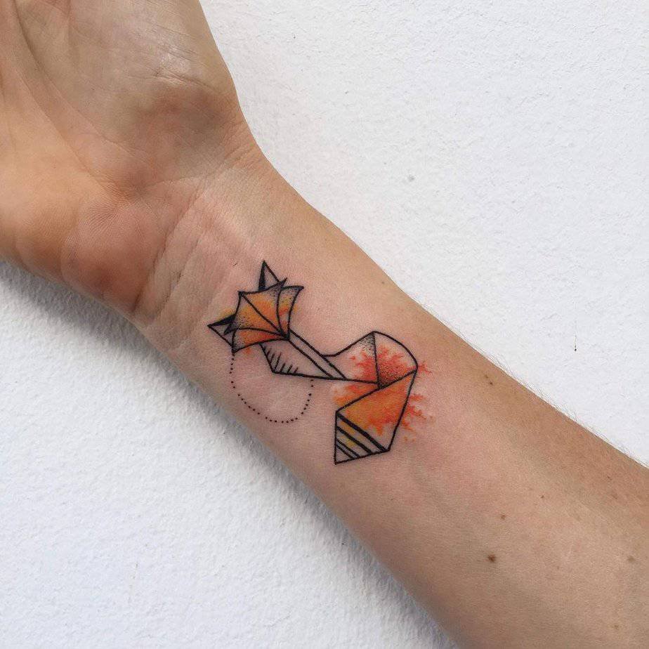Small wrist tattoos can be deceptively bold, and this little geometric fox with watercolor orange splashes is one of those. The soft color against the black geometry feels modern and tender—super cute and just enough attitude.