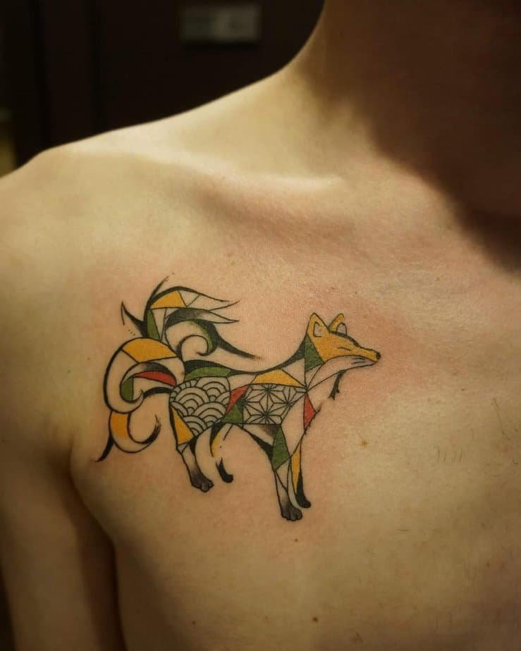 This whimsical fox is built from shapes and lines with pops of yellow, green, and red—majestic but gentle, with closed eyes that give it a peaceful vibe. It’s joyful and artistic, like a little celebration on skin.