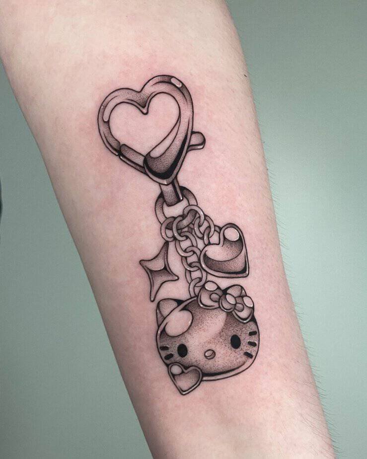 This forearm piece is so sweet — two cherries, but instead of regular fruit, there are two smiling kitty faces at the ends of the stems. It’s playful and feels like a tiny ode to friendship: Hello Kitty’s softness paired with scattered little hearts that scream “we stick together.” Totally charming.