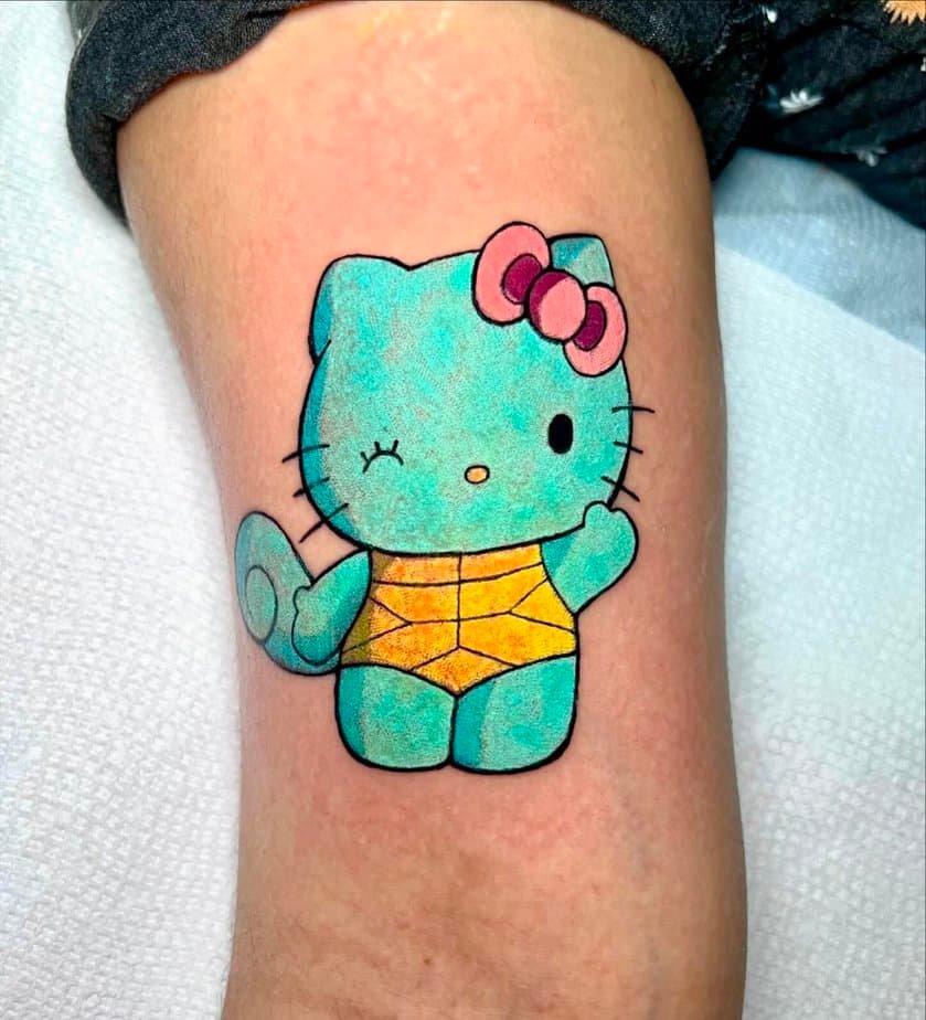 This upper-arm piece turns Hello Kitty into a Squirtle — aqua blue fur, a golden shell, and that iconic pink bow. One paw up like a Maneki Neko, so it’s all about good luck vibes. It’s playful, clever, and a perfect mashup for fans of both worlds.