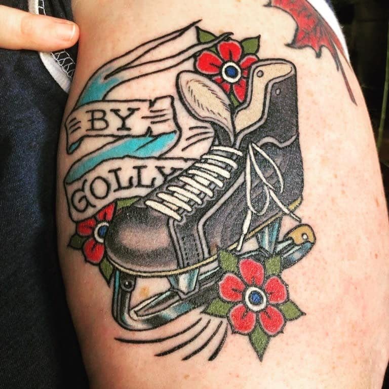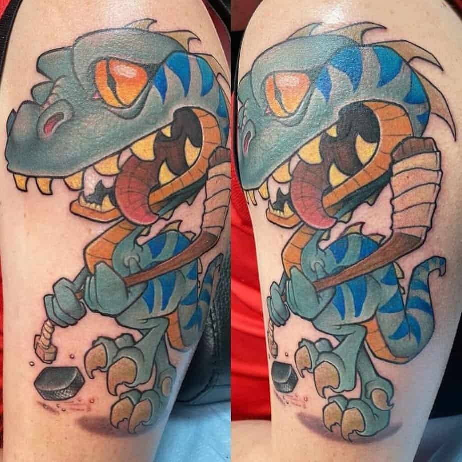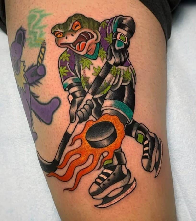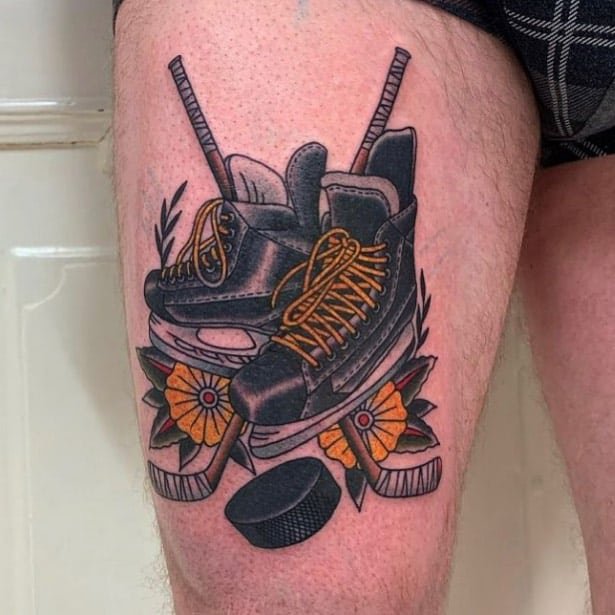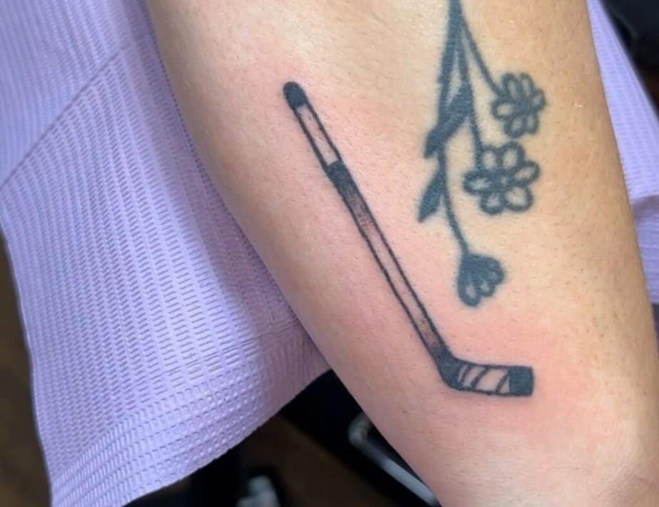 Then there are the mash-ups that refuse to be basic: black ink paired with bright yellow accents, skates and sticks arranged like they belong in a still life, or even a puck that’s clearly had enough and is ready to take a swing at the stick (yes, really — iconic). Flowers popping around skates turn a common motif into something sweeter, and new school pieces — think a dinosaur giving its all on the ice or a puck surrounded by flames — bring playful energy that’s hard not to grin at.