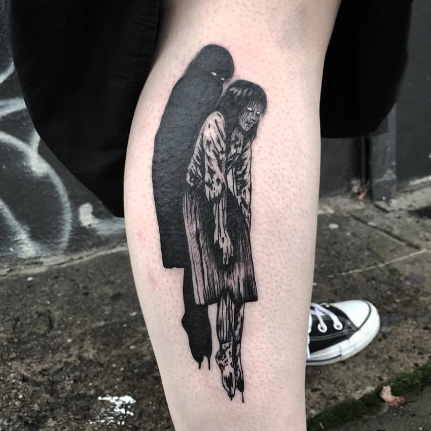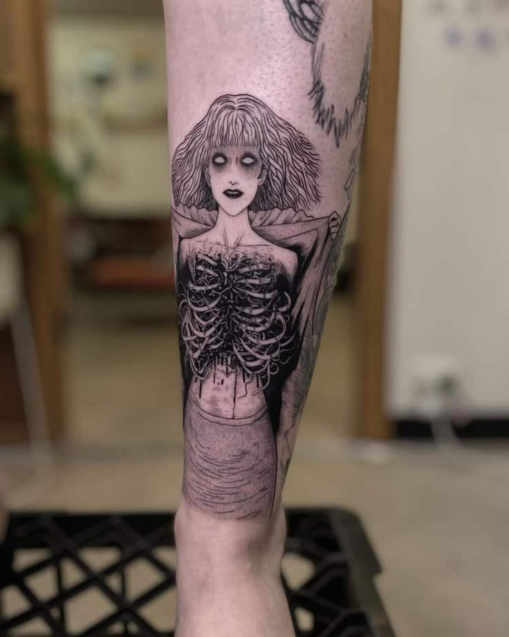 This one brings Junji Ito’s body horror to the forefront. The design freezes the exact moment a face becomes something else — slimy, slow, and impossible to unsee — with a slug sliding out of the mouth. It’s the kind of tattoo that lingers in your head: the texture, the expression, the way normal human features give way to something alien. Perfect if you want your ink to be unforgettable (and slightly nauseating, in the best way).