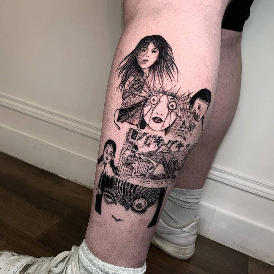 This leg tattoo is maximalist in the best way — Tomie, odd forms, fractured comic panels all mashed together into one continuous nightmare. It reads like a visual overload, which is fitting for Ito’s layered, multi-threaded chaos. If you’re a hardcore fan who wants many stories in one piece, this is it.