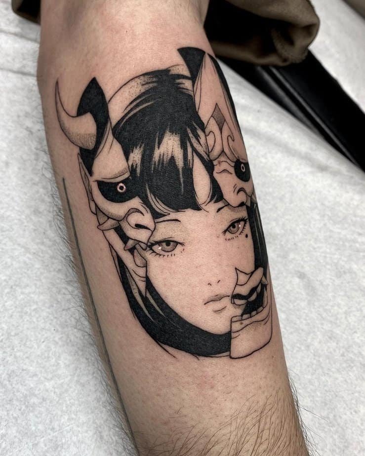 This tattoo leans into contrast: Tomie’s calm, almost angelic gaze set against the jagged, terrifying features of a Hannya mask. It’s a quiet statement about duality — beauty hiding its teeth — and it reads like a small thesis on how charming appearances can be dangerous. Clean, bold, and emotionally sharp.