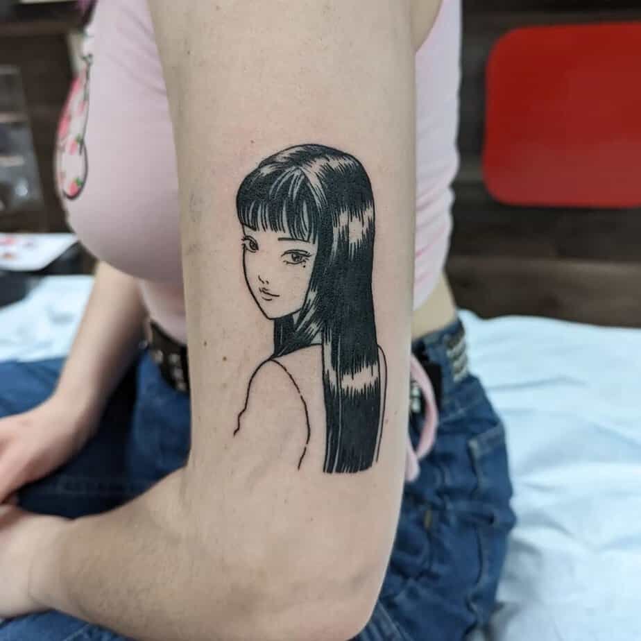 At first glance this feels almost gentle — Tomie’s expression is so composed it’s eerie. But anyone who knows Ito will see the threat simmering beneath. This upper-arm piece is for the person who likes subtle horror: it whispers menace rather than shouting it, and it stays with you long after you look away.