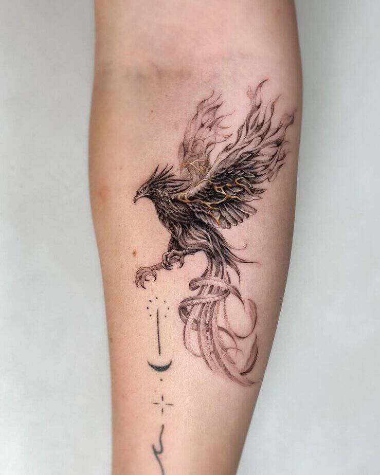 A phoenix done in black and gray with gold repairs — talk about symbolism. The breaks didn’t end it; they mended it into something stronger. If you want rebirth and resilience in one image, this is your pick.