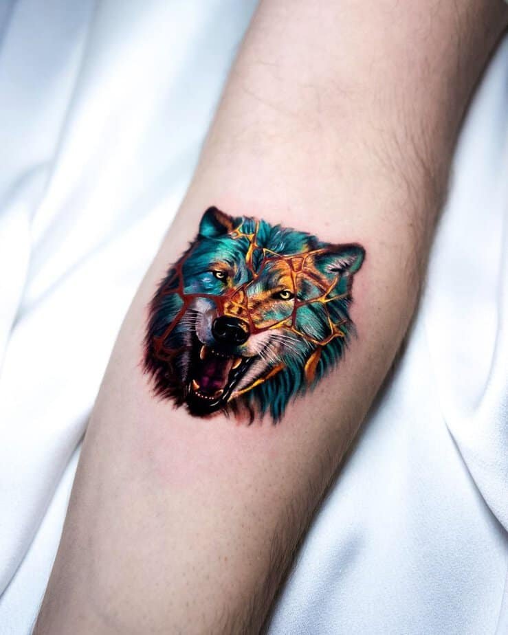 This one is bold — a realistic roaring wolf with vibrant blues and gold seams. It feels fierce and raw, a reminder that even the wildest among us can carry wounds. And those wounds don’t make them less; they add to their story. It’s a powerful pick if you want something unapologetically strong.