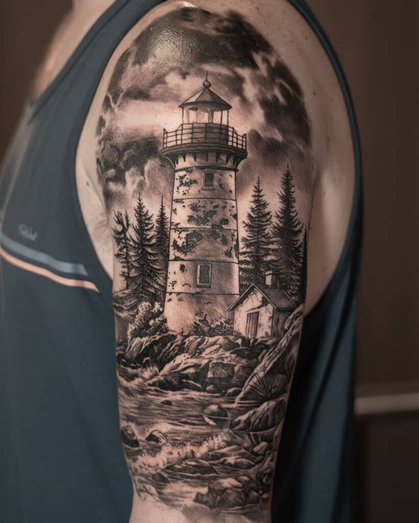 If you’re into tattoos that look like paintings, this smaller realistic lighthouse is perfect. It’s compact but full of the little details that make the scene feel alive — the kind of piece that, up close, makes you smile because your artist really nailed the mood.