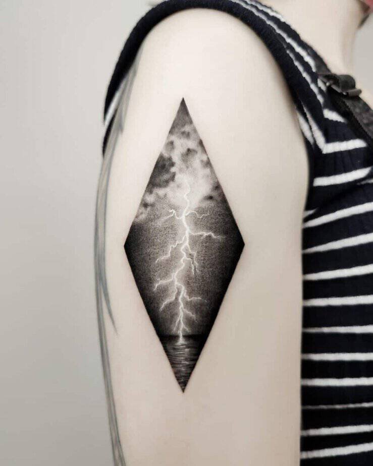 Unique pieces give you room to play with placement, negative space, and mixed styles. Think bolts that trace your eyebrow and drift down your cheek — they read like a scar story and feel cinematic. Or imagine a black square with a white lightning bolt inside, and geometric lines that connect it to a shaded tree below; the white-on-black detail is unexpectedly elegant. Some designs pack squiggly inner lines that make an otherwise simple bolt feel like a whole topographic world. There's even a lightning-in-a-bottle concept where clouds are little half-circles and the rain looks storybook-ish — a tiny pop of blue makes the whole thing sing. And one design shows a storm striking the sea, dramatic with deep grays and bright forks of light; it's moody and kind of epic. If you want your tattoo to be a conversation starter, these are the ones that will do it.