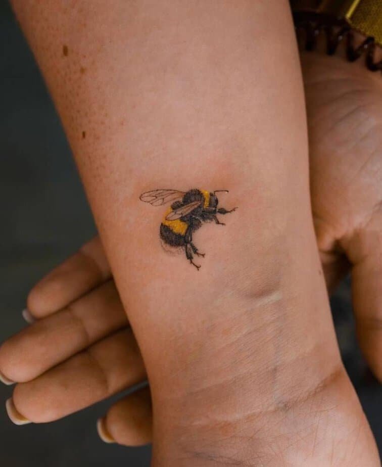 This wrist bee is adorable and sharp — the yellow and black stripes, the translucent wings, all done with such care. Bees stand for hard work, community, and loyalty, so this little guy feels like a quiet anthem to showing up and helping others.
