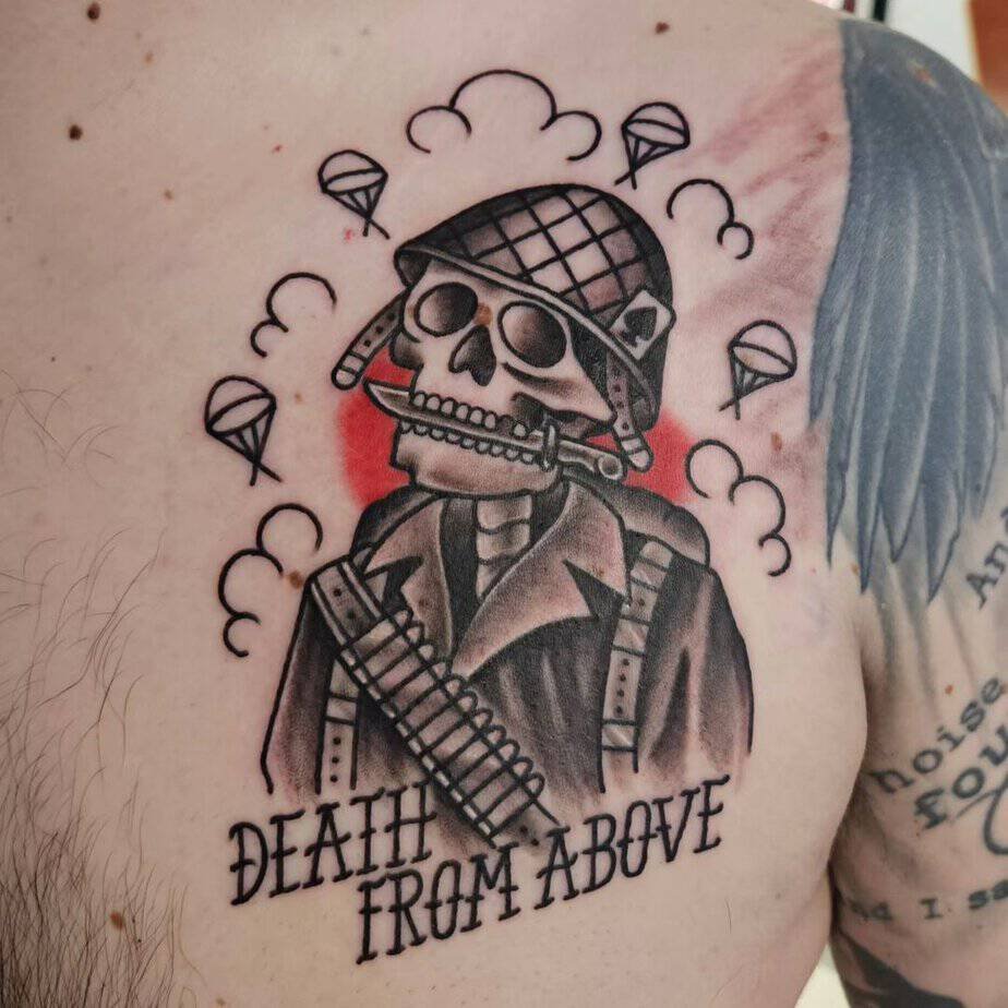 A skull in a paratrooper helmet — grim, brave, and unflinching. It’s a motto and a look that tells you exactly what it means.