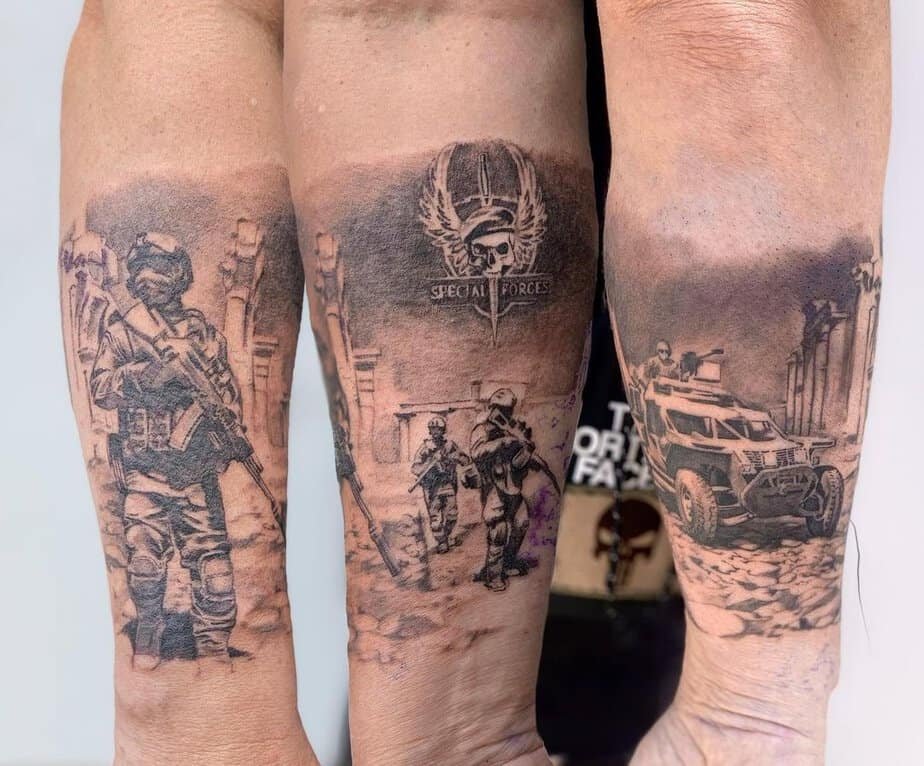 Detailed, dramatic, and full of action — a sleeve like this celebrates camaraderie, skill, and the intense life of special ops. It’s for someone who wants their ink to tell a whole saga.
