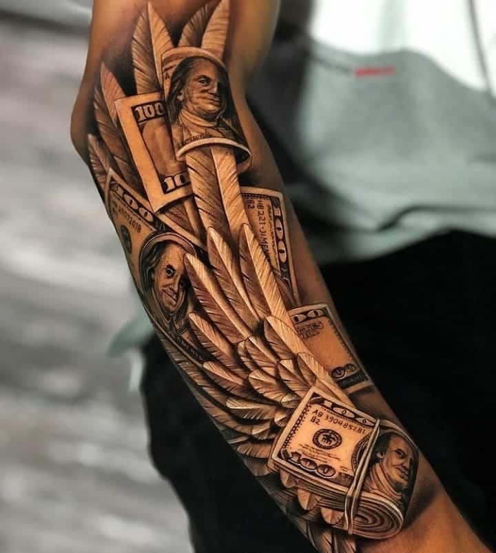 If you’re ready to commit, a half-sleeve or full sleeve gives you space to tell a whole story. I love pieces that put a centerpiece — like a big diamond — and then scatter money, bags, and tiny characters around it. Some sleeves have little scenes: someone counting bills, angels that look like statues praying for abundance, or shading that turns backgrounds into depth so the money elements pop. The longer you look, the more tiny details show up — feathers, light glints, little shadows — and it feels like a whole world on your arm.